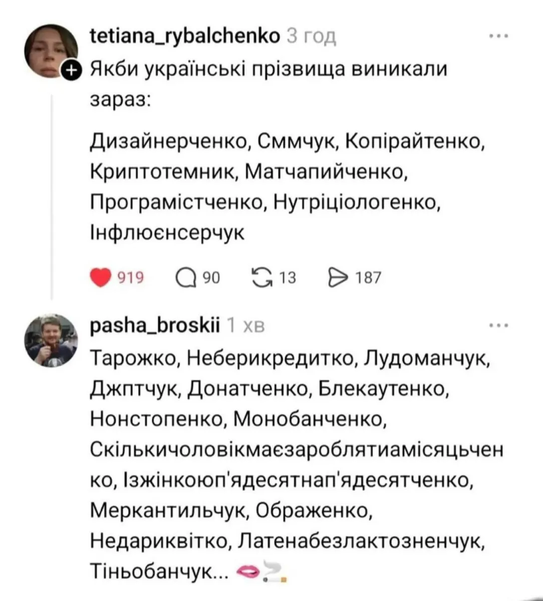 Допис в Threads опублікувала Тетяна Рибальченко опублікувала кумедний список вигаданих українських прізвищ, які могли б виникнути, якби іноземці адаптували свої імена до місцевих традицій.