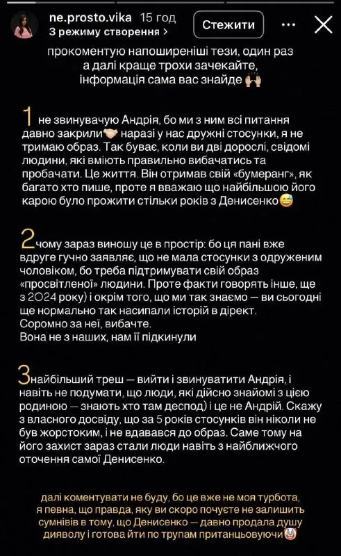 «Не звинувачую Андрія, бо ми з ним усі питання давно закрили. Наразі у нас дружні стосунки. Він отримав свій “бумеранг”, як багато хто пише, проте я вважаю, що найбільшою його карою було прожити стільки років з Денисенко. Ця пані вже вдруге гучно заявляє, що не мала стосунків з одруженим чоловіком, бо треба підтримувати свій образ «просвітленої» людини. Проте факти говорять інше. Ще з 2024.», – зазначила Вікторія.