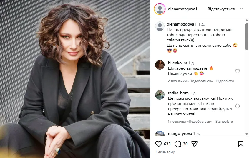 У своєму блозі в Instagram Мозгова поділилася роздумами про людей, спілкування з якими з часом стало емоційно важким. За її словами, їхній добровільний вихід із її життя приніс відчуття полегшення та внутрішнього спокою.