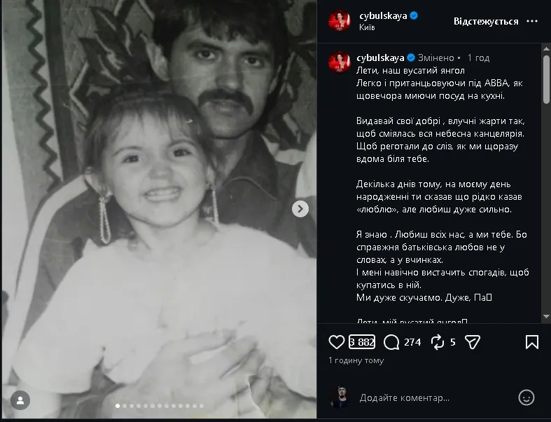 У прощальному зверненні Цибульська назвала батька своїм «вусатим янголом» і згадала їхні домашні моменти — жарти, сміх і музику, яка завжди лунала поруч. Ці прості спогади стали для неї справжнім скарбом, що залишиться назавжди.