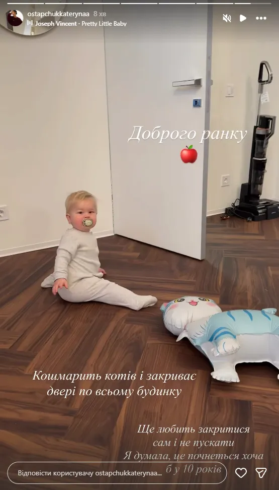 У сторіс в Instagram вона з гумором розповіла, що хлопчик уже встиг стати «терором» для домашніх котів, а також має звичку закривати двері по всьому будинку. За словами блогерки, син полюбляє усамітнюватися і не пускати нікого до кімнати.