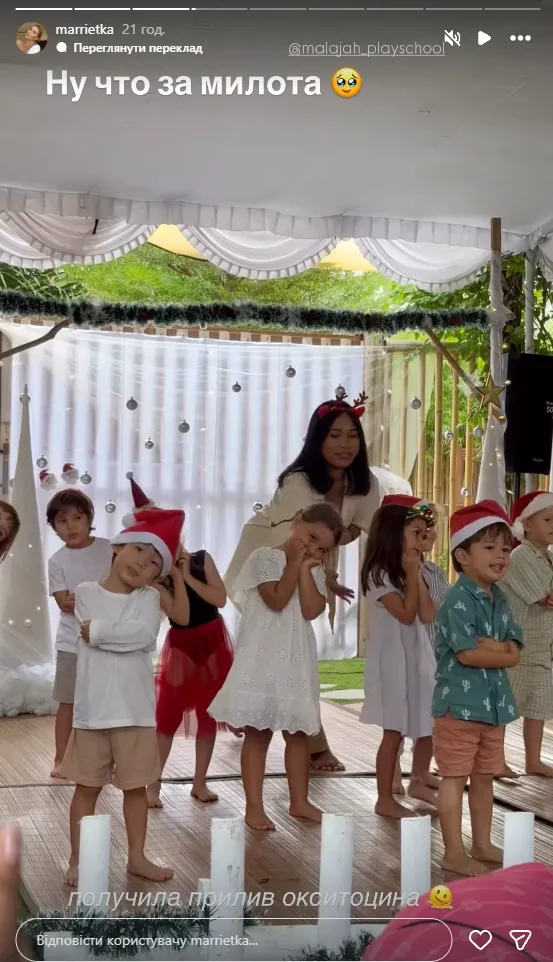 Спочатку Марія опублікувала зворушливі відео з новорічного виступу дітей у садочку. На кадрах — святкова атмосфера, костюми, ялинка та щирі дитячі емоції.