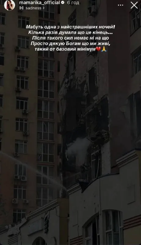 «Мабуть, одна з найстрашніших ночей! Кілька разів думала, що це кінець… Просто дякую Богам, що ми живі. Такий от базовий мінімум», – написала MamaRika.