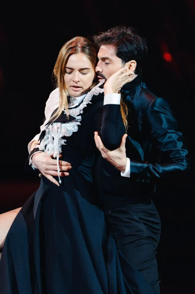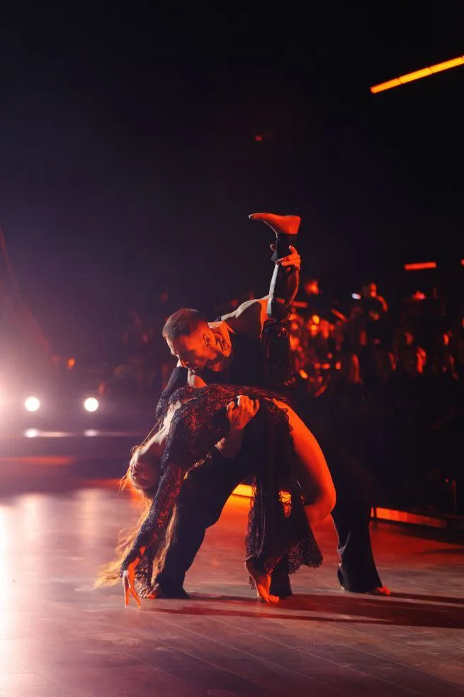 Женя Галич і Яна Цибульська працюють над емоційним пасодоблем, що акцентує на силі характеру та внутрішній боротьбі.