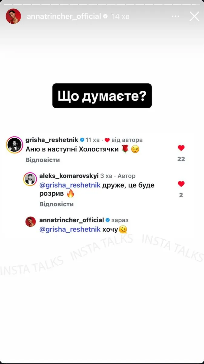 У сторіс Instagram Анна Трінчер опублікувала скрін коментарів, де ведучий Григорій Решетнік запропонував їй взяти участь у шоу «Холостячка».