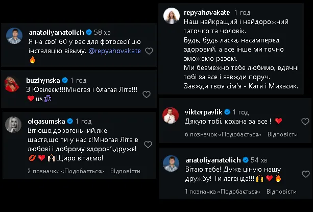 Співачка Катерина Бужинська побажала артисту «Многая і благая літа», а колеги з шоу-бізнесу ділилися спогадами про спільні концерти та гастролі.