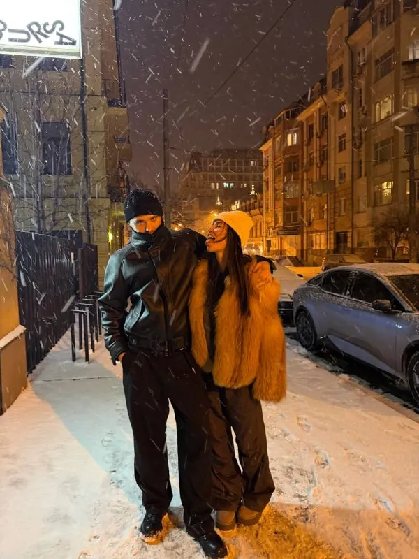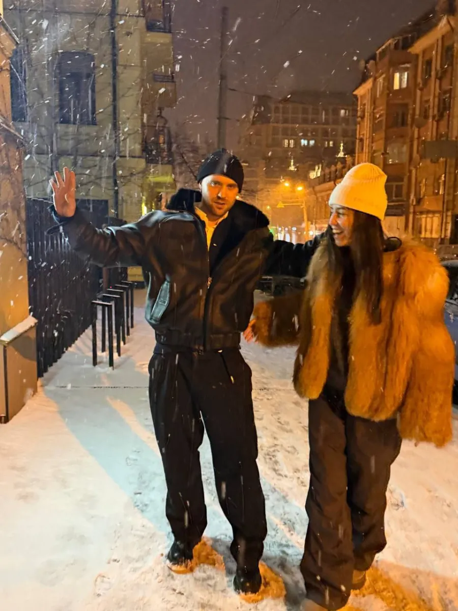 Пара зробила кілька романтичних фото разом. На одному зі знімків Дорофєєва по-дитячому ловить язиком сніжинки, тоді як коханий ніжно обіймає її, дивлячись у камеру.