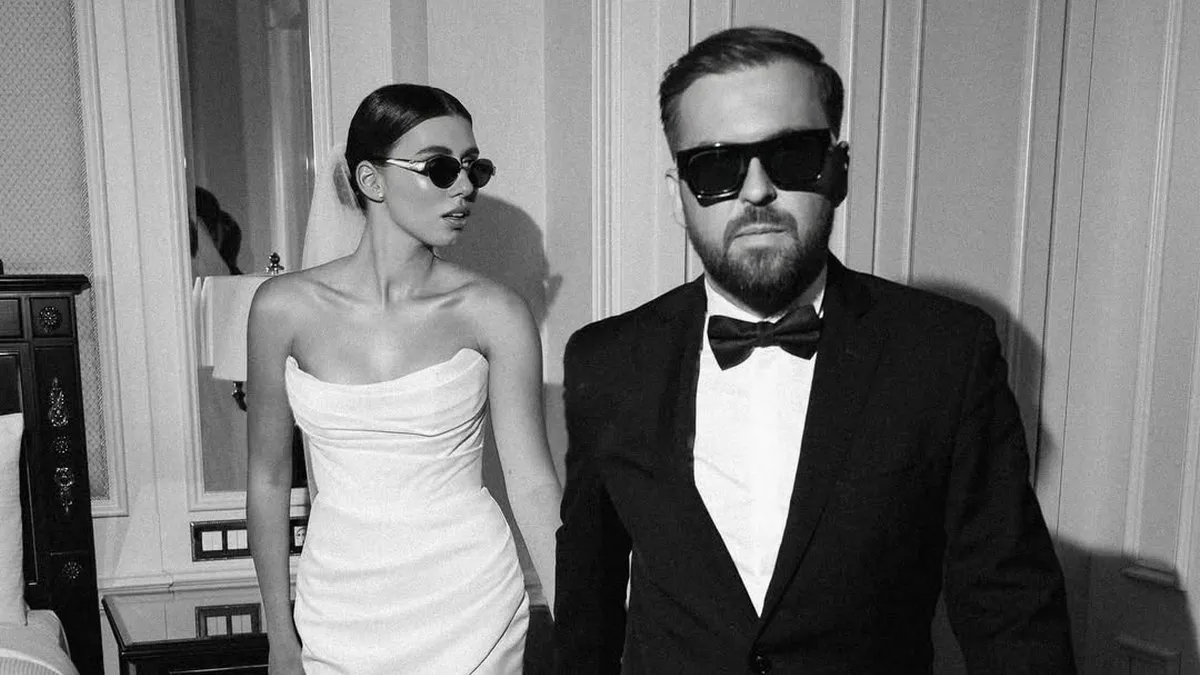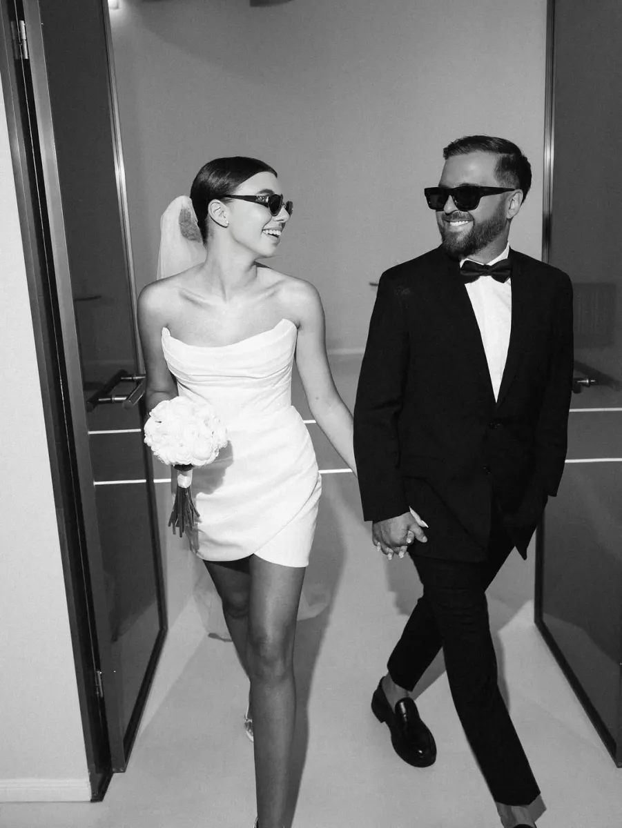 Весільні фото пари витримані у стилі стриманого Голлівуду. Закохані позували в готельному номері, обравши лаконічні, але елегантні образи. Юліана з’явилася у короткій білій сукні та фаті, зробивши акцент на мінімалізмі. Сергій обрав класичний костюм із метеликом, що додало образу святкової строгості.