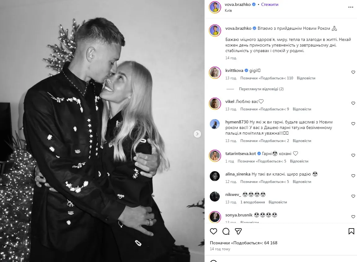 Футболіст Володимир Бражко поділився стильним чорно-білим знімком зі своєю коханою біля ялинки, побажавши українцям стабільності.