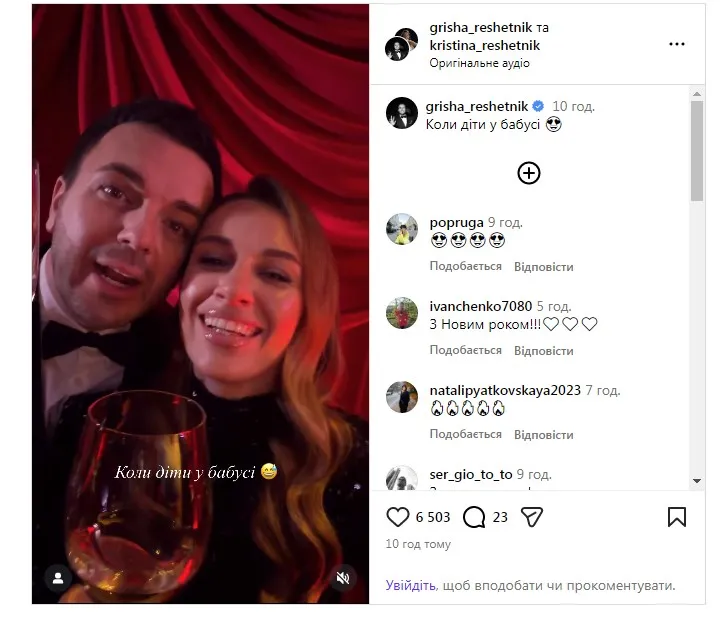 Телеведучий Григорій Решетнік із дружиною Христиною вирішили присвятити час одне одному. Пара опублікувала веселе відео з келихами шампанського на тлі червоних куліс.