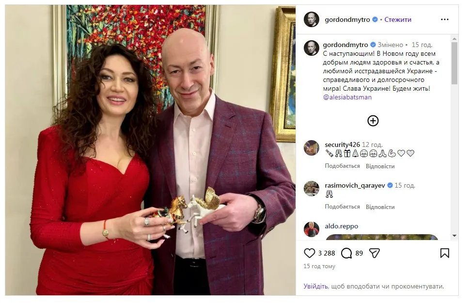 «У Новому році всім добрим людям здоров'я і щастя, а улюбленій вистражданій Україні – справедливого і довгострокового миру! Слава Україні! Будемо жити!», – зазначив Гордон.