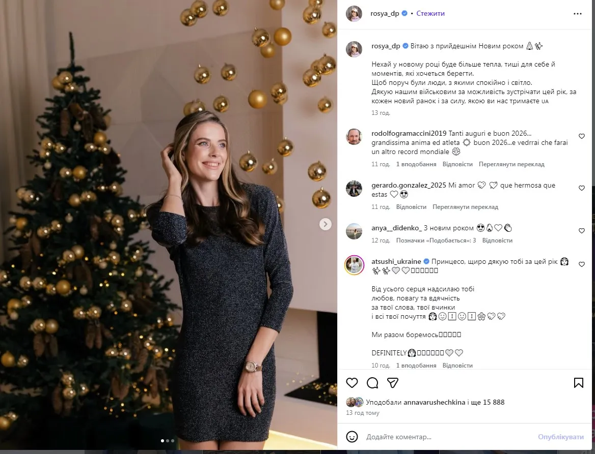 «Вітаю з прийдешнім Новим роком. Нехай у новому році буде більше тепла, тиші для себе й моментів, які хочеться берегти. Щоб поруч були люди, з якими спокійно і світло. Дякую нашим військовим за можливість зустрічати цей рік, за кожен новий ранок і за силу, якою ви нас тримаєте», – написала Магучіх.