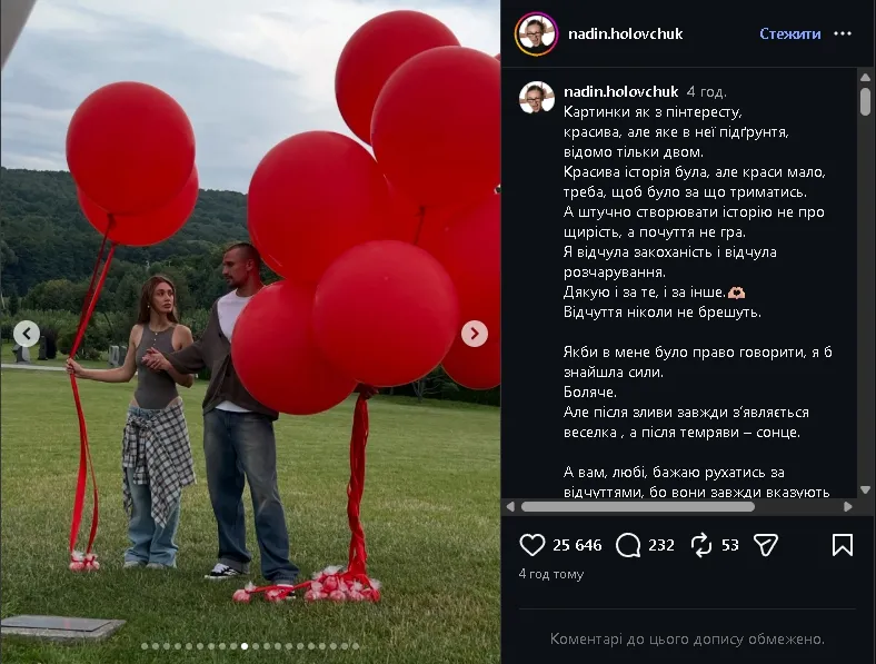Вона завершила допис словами, що «шлях у цій історії завершено. Але серце відкрите, тому що людьми ми є тільки тоді, коли любимо», процитувавши пісню «Люди» гурту «Бумбокс».
