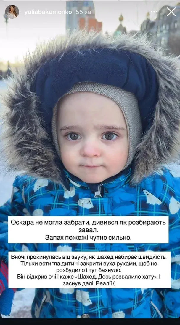 Юлія поділилася в Instagram, що прокинулася від характерного звуку «Шахеда», який заходив на ціль. За мить до вибуху вона встигла закрити руками вуха сина, але хлопчик усе одно прокинувся.