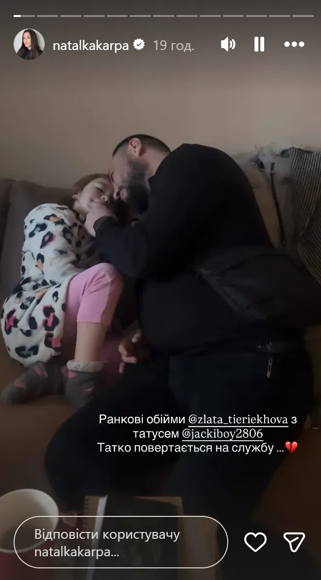 «Ранкові обійми з татусем. Тато повертається на службу 💔», – підписала сторіс Наталка.