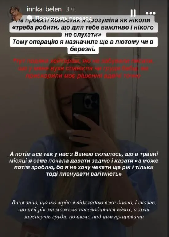 «Тому операцію я призначила ще в лютому чи березні. Тут подяка хейтерам, які не забували писати, що я маю вуха спанієля або груди бабки. Ви прискорили моє рішення вдвічі точно. А потім усе так у нас із Ванею склалося, що в травні я сама почала давати задню і казати: “А може, потім зроблю, бо я не хочу чекати ще рік і тільки тоді планувати вагітність”», – розповіла Інна.