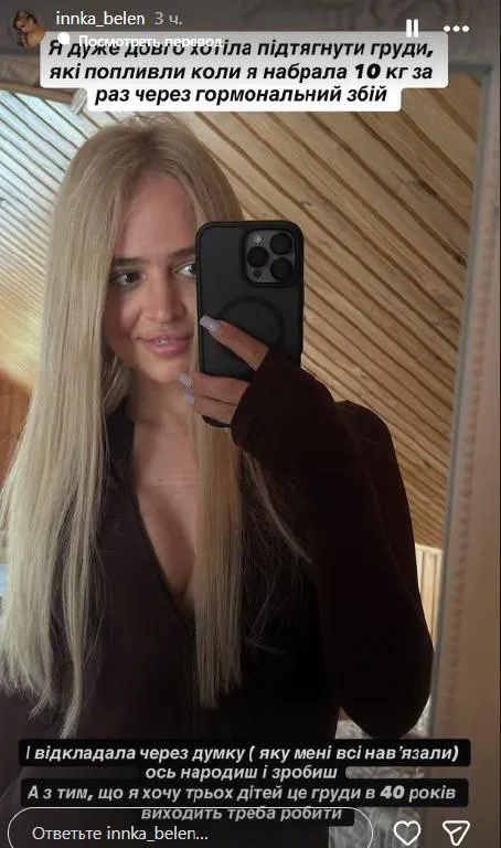 «Я дуже довго хотіла підтягнути груди, які “попливли”, коли я набрала 10 кг за раз через гормональний збій. І відкладала через думки, які мені всі нав’язали: “ось народиш і зробиш”. А з тим, що я хочу трьох дітей, то це груди в 40 років виходить – треба робити», – відверто зізналася Бєлєнь.