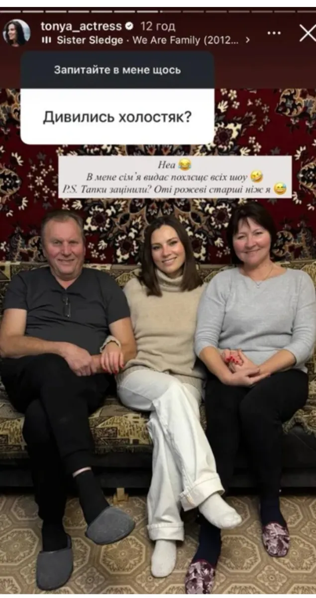Антоніна не стала приховувати правду і відповіла максимально іронічно. Вона опублікувала атмосферне домашнє фото з батьками на тлі традиційного настінного килима, давши зрозуміти, що реальне життя для неї було цікавішим за телевізійні пристрасті. Перегляд реаліті-шоу, як виявилося, не входив до її планів.