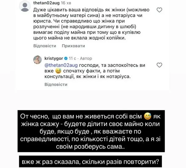 У сторіс Горняк показала анонімні закиди про нібито несправедливий поділ майна. Вона наголосила, що діє виключно в межах закону: усе, що нажито у шлюбі, ділиться порівну, якщо немає шлюбного договору.