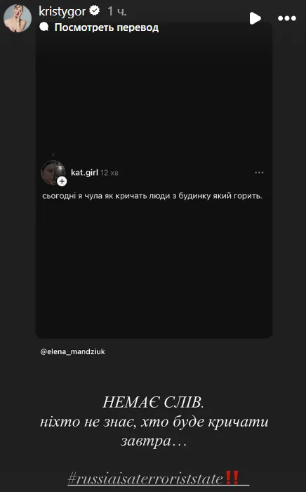 Акторка Катя Кузнецова у Instagram Stories опублікувала емоджі зі сльозами, висловлюючи свій шок і співчуття постраждалим.