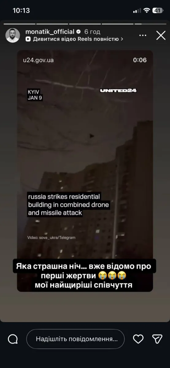 Масована нічна атака 9 січня 2026 року РФ в Україні викликала шок у суспільстві. Українські актори, ведучі, співачки та блогери висловили свою підтримку та співчуття у соцмережах, публікуючи відео, емоджі та слова солідарності.