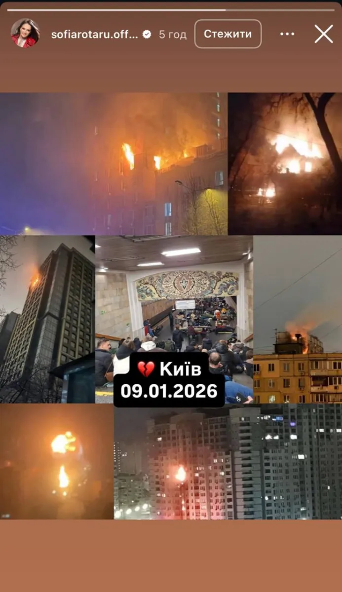У сторіз зірка поділилася колажем із кількох знімків: палаючі багатоповерхівки, евакуація людей до метро та руйнування у різних районах міста. Усі фото супроводжувалися підписом «Київ 09.01.2026».