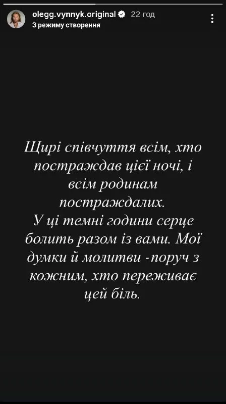 У сторіс співак емоційно звернувся до своїх підписників і висловив щирі співчуття всім, хто постраждав тієї жахливої ночі. Артист зізнався, що його серце болить разом із кожною родиною, та наголосив, що підтримує постраждалих своїми думками й молитвами.