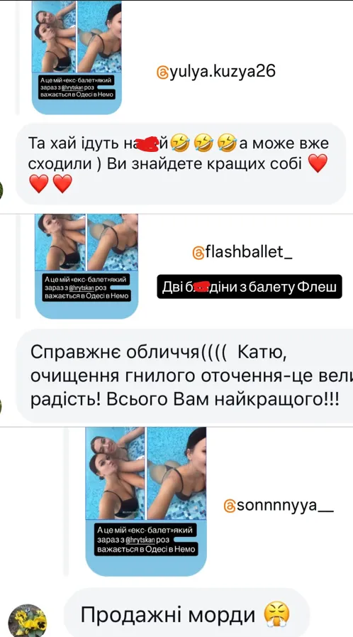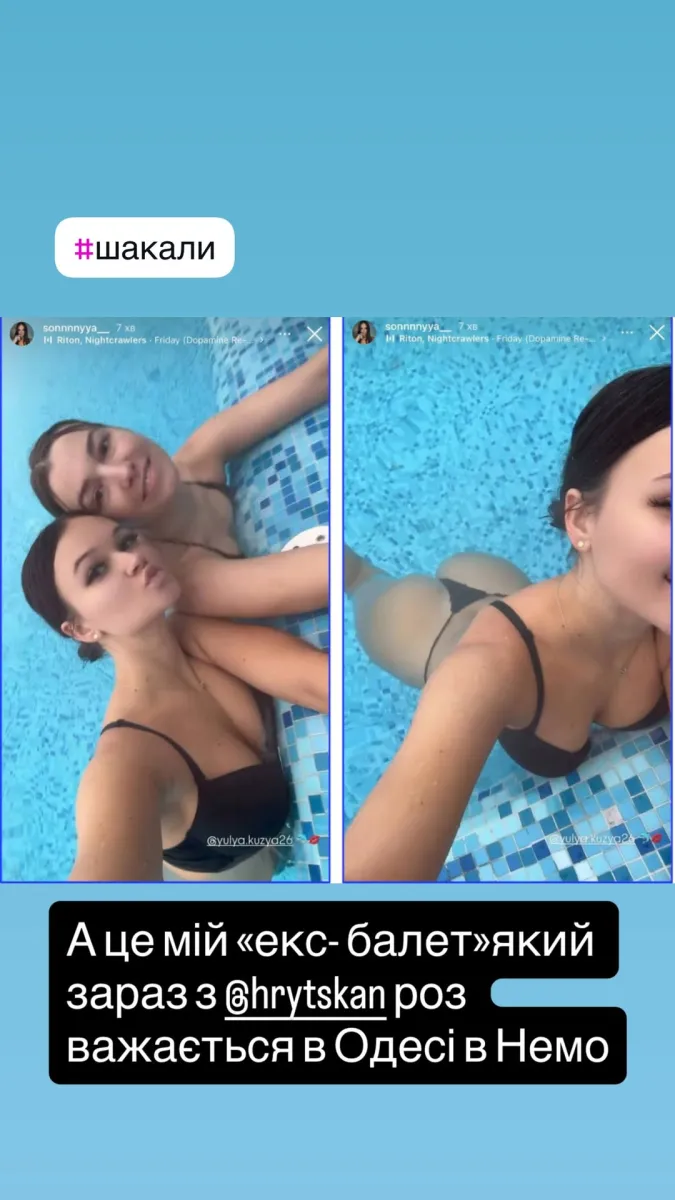 Після розголосу цієї ситуації Бужинська пішла далі та опублікувала в сторіз свого Instagram скриншоти контенту танцівниці Софії Голуб. На фото вона відпочиває в басейні з колегою, Юлією Кузьменко. Обидві дівчини були учасницями балету Flash, який працює з Бужинською. В сторіз артистка наголосила, що тепер дівчата працюють з Грицканом.