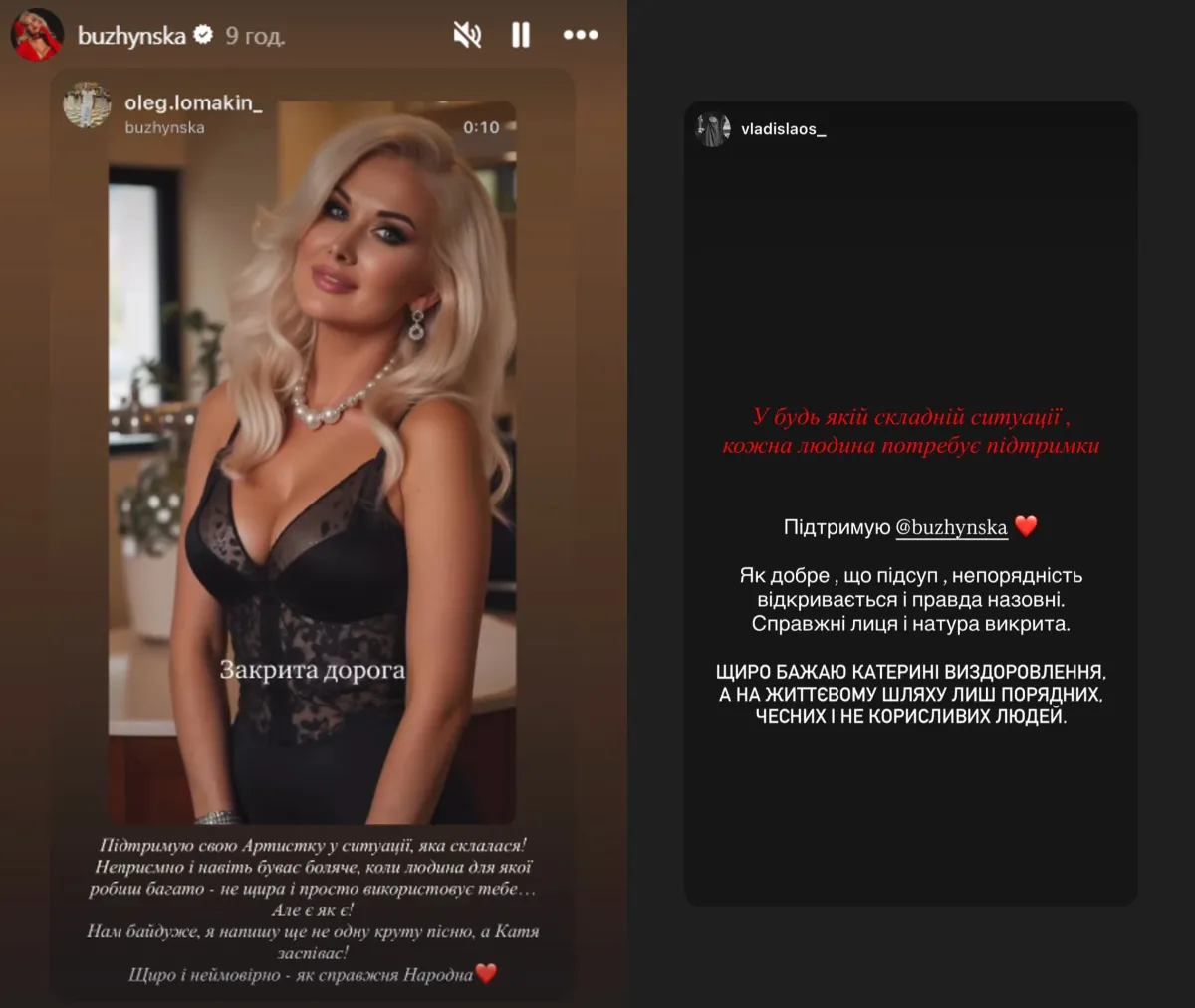 Натомість Бужинська активно робить репост сторіз зі словами підтримки у свій бік. Так, наприклад, на її сторону став відомий автор пісень Олег Ломакін. Зазначимо, що BLIK.ua звертався до Бужинської по коментар. Співачка оперативно відповіла на запит, зазначивши, що поки не готова до комунікації та подякувала журналістам за проявлений інтерес. Щодо Михайла Грицкана, то запит медіа на коментар залишився непрочитаним.