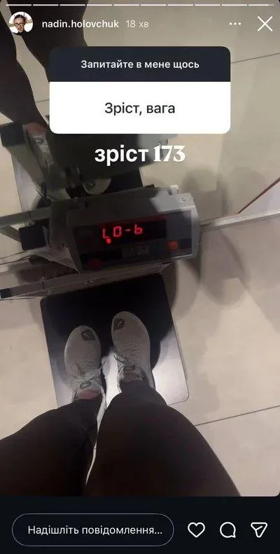 Як відомо, колишня обраниця Тараса Цимбалюка вирішила відверто поспілкуватися з підписниками. Одне із запитань стосувалося параметрів фігури, на яке Надін з радістю відповіла – і не лише словами. Дівчина стала на ваги та опублікувала фото в сторіс. За її словами, при зрості 173 см вона важить близько 57,6 кг.