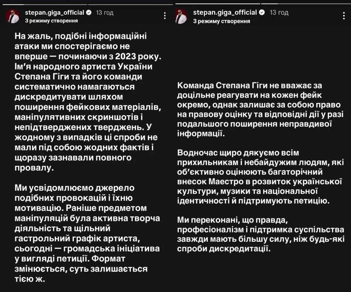 Команда та близькі люди померлого народного артиста України Степана Гіги оприлюднили в Instagram заяву про систематичні інформаційні атаки. У Stories Instagram родичі співака повідомили, що подібні провокації спостерігаються з 2023 року.