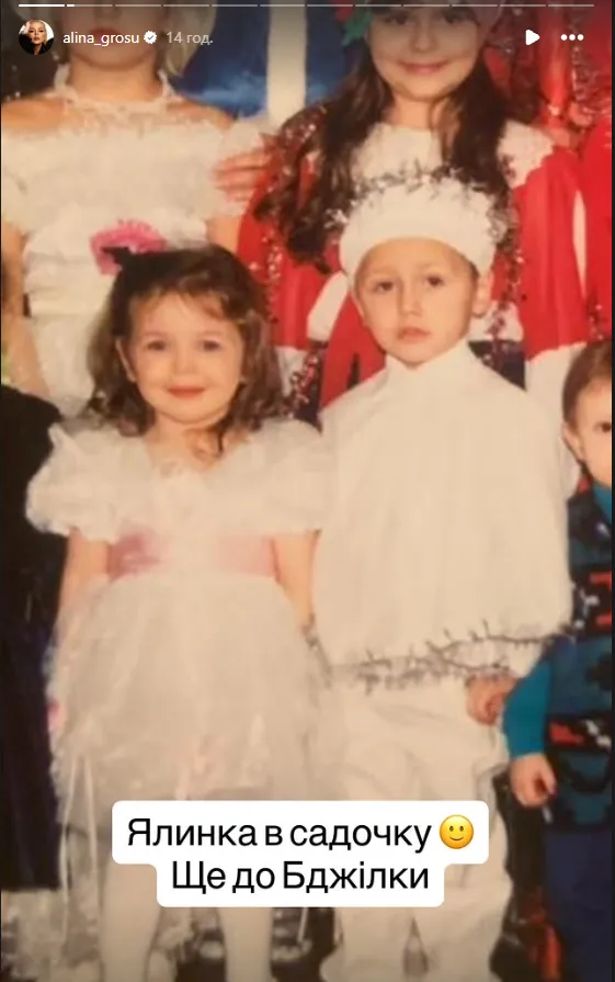 Далі співачка опублікувала світлину зі святкування Нового року в садочку. На фото Гросу позує у білій сукні поруч з хлопчиком і згадує, що це було ще до того, як вона стала відомою співачкою та зняла кліп на хіт «Бджілка».