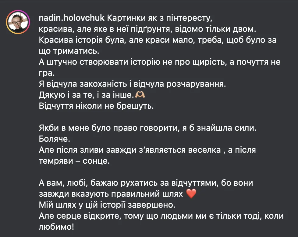 Зрештою, історія завершилася болісно, а Надін зізналася прокоментувала заяви Тараса та розповіла, що розрив став для неї важким емоційним досвідом.