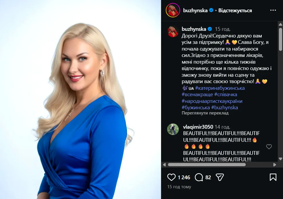 «Згідно з призначенням лікарів мені потрібно ще кілька тижнів відпочинку, поки я повністю одужаю і зможу знову вийти на сцену та радувати вас своєю творчістю», – йдеться в дописі Катерини Бужинської.