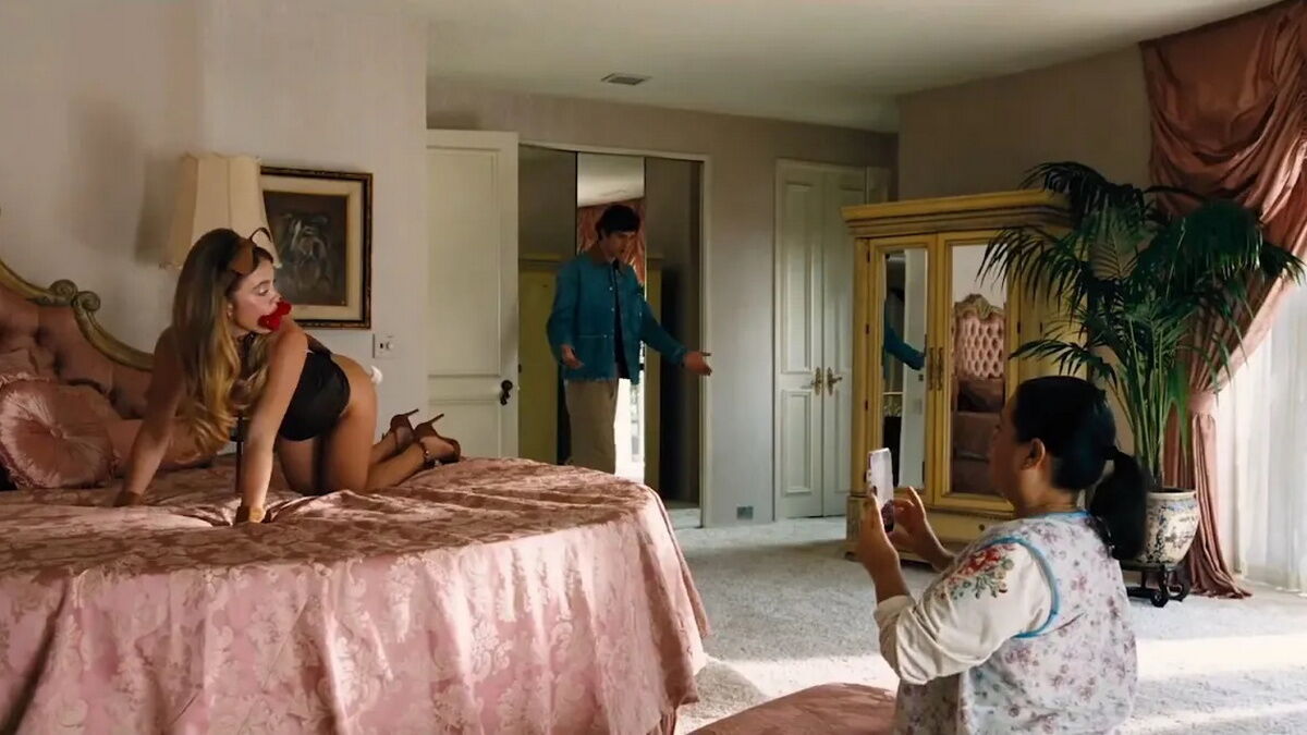 Одягнена лише в атласний коричневий корсет, крихітні стрінги та вушка цуценяти, героїня Сідні грайливо позує перед камерою, поки жінка, схожа на її хатню робітницю, робить знімки.