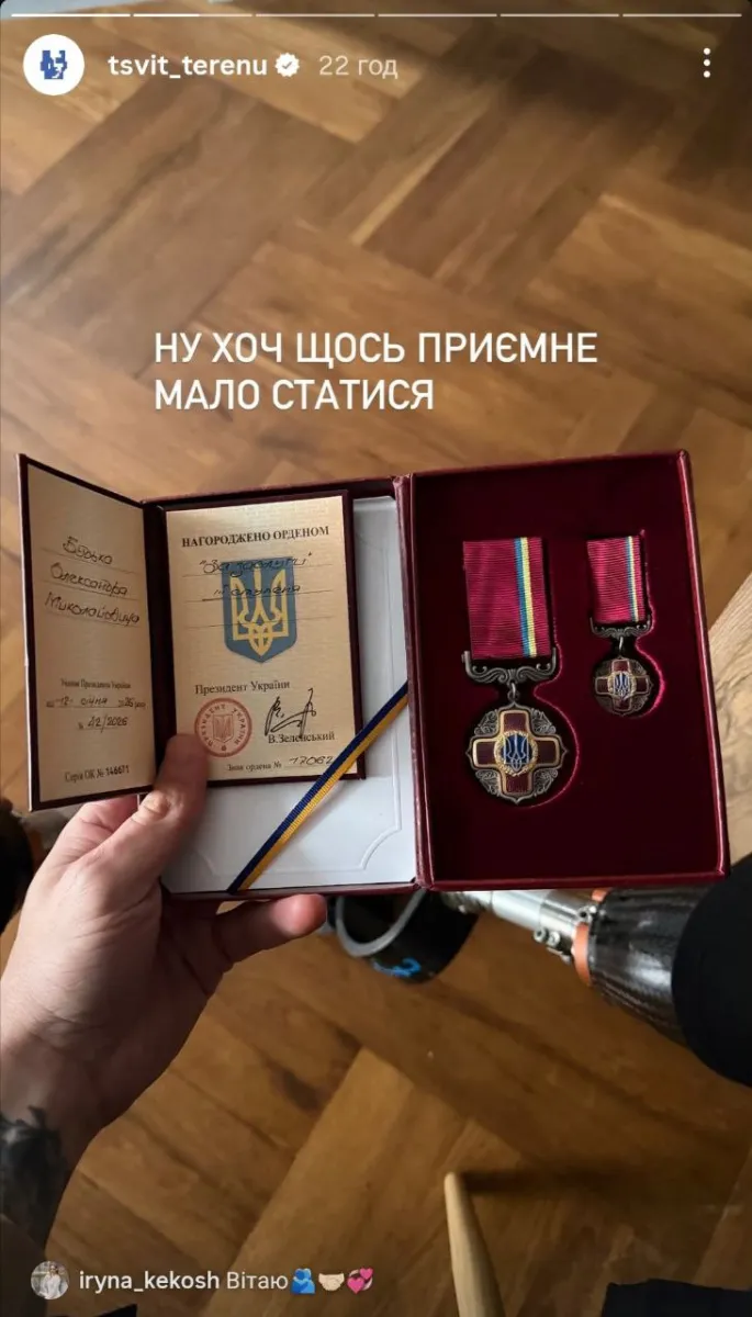 Український військовий та ветеран російсько-української війни Олександр Терен отримав орден «За заслуги» III ступеня та поділився своїми враженнями. Про це стало відомо з його сторінки в Instagram.