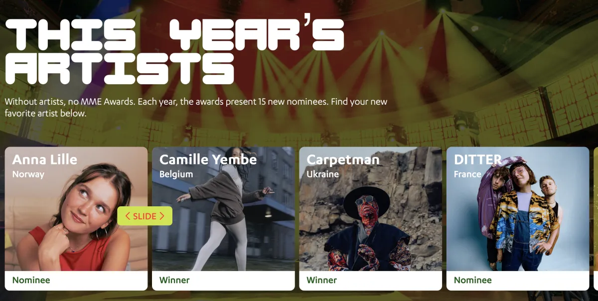 MME Awards є флагманською музичною нагородою Європейського Союзу, що співфінансується програмою Creative Europe та спрямована на підтримку артистів, які формують майбутнє європейської сцени.
