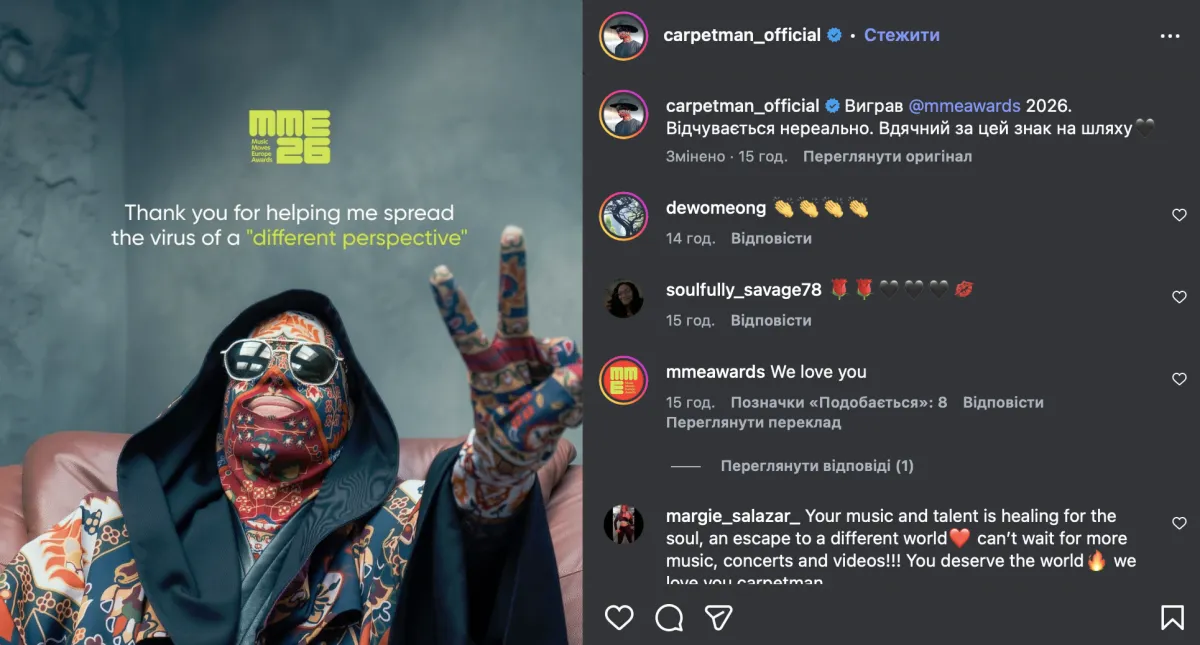 Успіх Carpetman продовжив серію перемог українських представників на MME Awards. Раніше лауреатами премії ставали alyona alyona у 2021 році, Alina Pash у 2022-му та Jerry Heil у 2023 році.