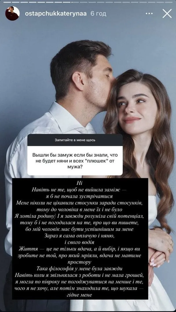 Катерина наголосила, що завжди адекватно оцінювала власний потенціал і прагнула бачити поруч із собою чоловіка, який перевершує її в досягненнях. За її словами, вона б не погодилася на сценарій життя без комфорту, про який писали підписники.