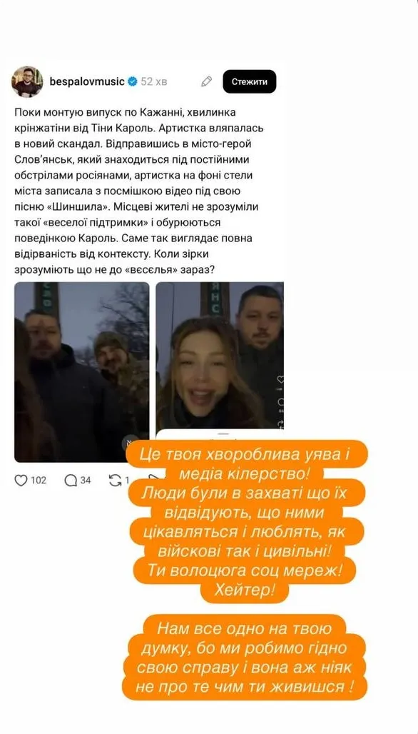 Блогер зреагував на відео, де артистка під час поїздки до Слов'янська, який перебуває під постійними обстрілами росіян, посміхається та записує контент під пісню «Шиншила». Беспалов зазначив, що місцеві жителі не зрозуміли таких «веселих підтримок» і обурюються поведінкою співачки. Він поставив риторичне запитання: «Коли зірки зрозуміють, що не до вєсєлья зараз?»