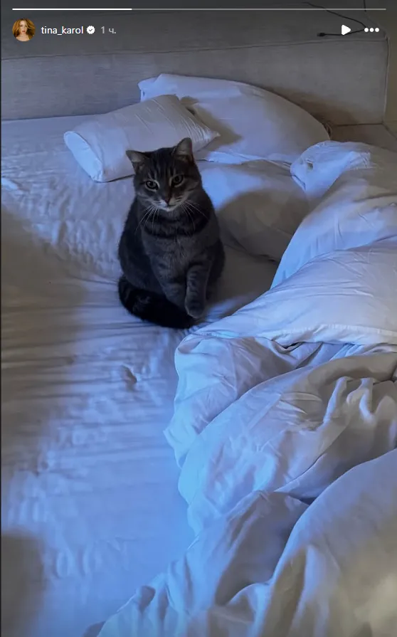 Українська співачка Тіна Кароль поділилася у своїх Instagram Stories зворушливим фото того, хто чекає на неї вдома. На світлині видно сіру кішку на ліжку артистки. Улюбленицю зірки звуть Джавеліна.