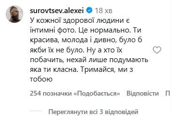 «У кожної здорової людини є інтимні фото. Це нормально. Ти красива, молода і дивно, було б якби їх не було. Ну а хто їх побачить, нехай лише подумають яка ти класна. Тримайся, ми з тобою».