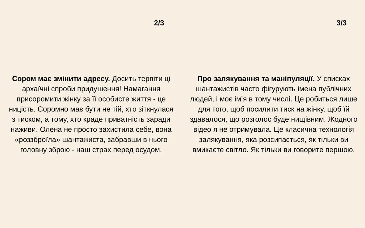 Ведуча наголосила, що шантаж – це не про інтим, а про контроль. Це, на думку Єфросиніної, про спробу керувати страхом. Бо більшість українців вчили боятися осуду.