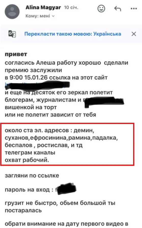 У своєму листі зловмисники зазначили, що розішлють інтимні відео з Оленою Тополею, зокрема Маші Єфросиніній, Славі Дьоміну, Олексію Суханову, Раміні Есхакзай та іншим публічним особам, а також представникам медіа.