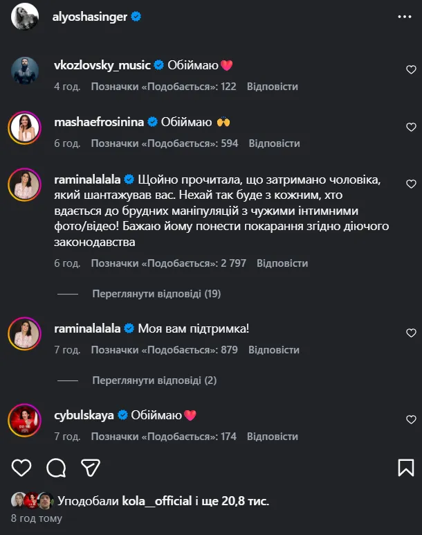 «Моя підтримка вам. Щойно прочитала, що затримано чоловіка, який шантажував вас. Нехай так буде з кожним, хто вдається до брудних маніпуляцій з чужими інтимними фото/відео! Бажаю йому понести покарання згідно з чинним законодавством», – написала Раміна Есхакзай.