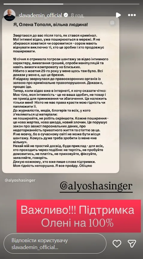 Лаконічніше підтримав Олену Тополю теле- та радіоведучий Слава Дьомін, якому злочинці планували надіслати інтимні відео з Оленою Тополею.