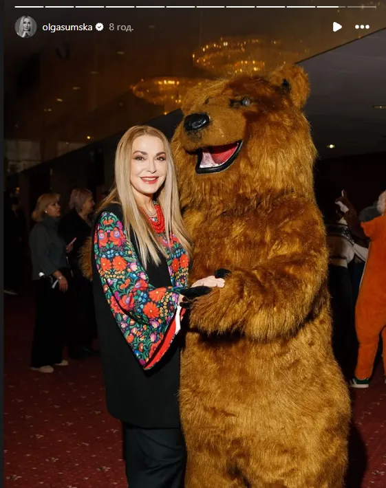 Народна артистка України Ольга Сумська поділилася в Instagram Stories незвичайним знімком зі столичної події, що відбулася у легендарному Палаці «Україна». На фото акторка постає поруч із величезним ведмедем у костюмі.