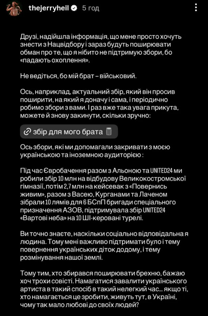 «Ви точно знаєте, наскільки соціально відповідальна я людина. Тому мені важливо підтримати було і тему повернення українських діток додому, і тему розмінування нашої землі. Тому тим, хто збирався поширювати брехню, бажаю хоч трохи совісті. Намагатися завалити українського артиста в такий спосіб і в такий нелегкий час…».