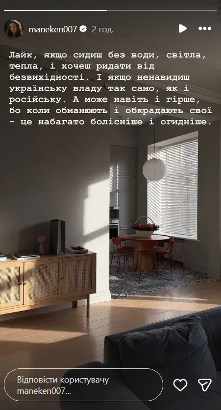 У своїх Instagram Stories блогерка опублікувала світлину квартири, залитої ранковим сонцем. Хоча фото виглядало естетично, немов із Pinterest, настрій автора був діаметрально протилежним. Замість того, щоб спрямувати гнів на країну-агресора, Манекен вирішила висловити претензії українській владі.