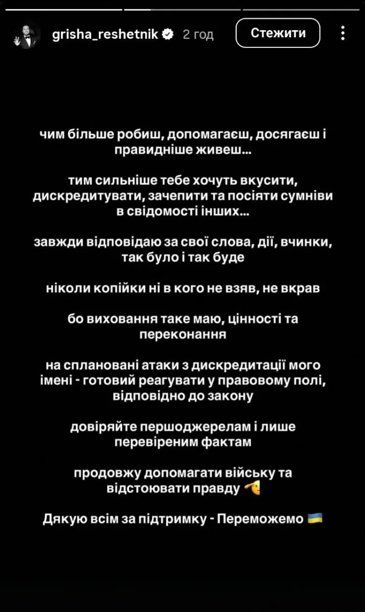 Український телеведучий Григорій Решетнік, відомий за популярним проєктом про пошук кохання «Холостяк», зробив публічну заяву щодо благодійних коштів, які подружжя збирало для постраждалих після ракетного удару по лікарні «Охматдит» у 2024 році і наголосив що буде звертатися до суду. Про це зірка телебачення написав у своєму Instagram.